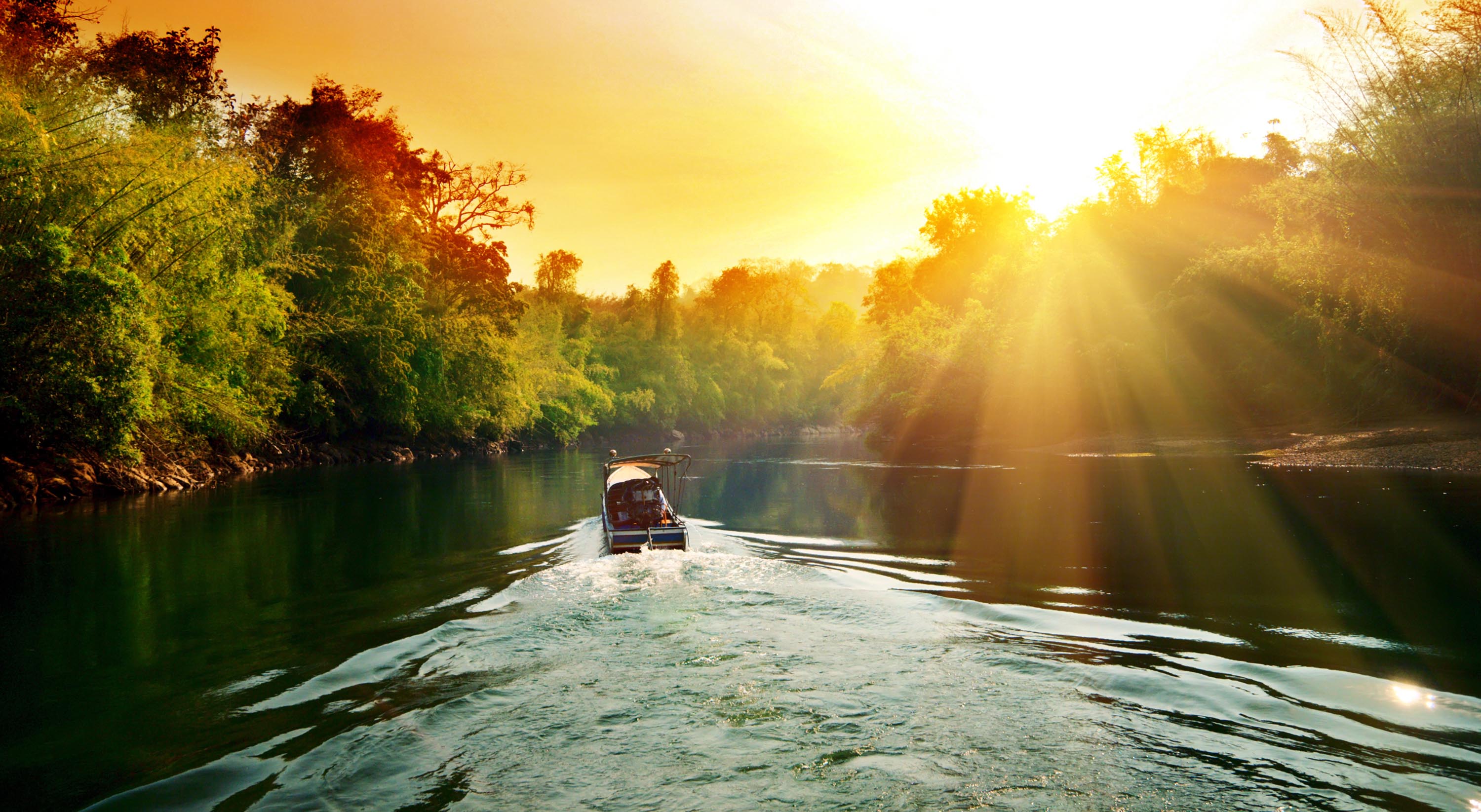 Vi ser vandfald i syv plateauer, og vi vandrer ind i junglen til en symfoni af cikader og fuglefløjt. Vi sejler på floden gennem et natursceneri så smukt, at thaierne har døbt området lille Schweiz. Vi lægger til og besøger stammelandsbyer, der i generationer har boet på flodbredden i hytter af flettet bambus og gulv af stampet lerjord.